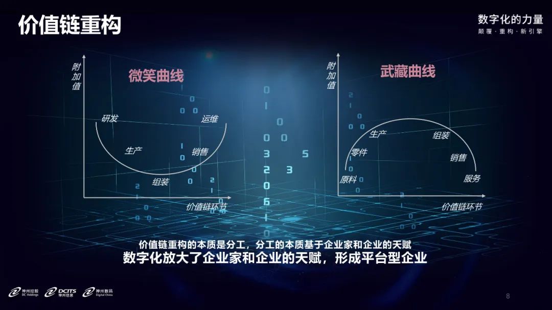 这是一个产业链的图形,左侧是比较知名的微笑曲线,整个产业最有价值的在微笑曲线的前后两端,是研发和最终面向客户的运维服务。这是当年宏碁的总裁发明的,后来日本人提出了不同的观点,就是武藏曲线——在中间的阶段仍然可以产生巨大的价值。这两条曲线给我们的启发是一个城市的发展在任何一个节点上都有可能突破,关键取决于人和组织的天然禀赋。数字化的力量最本质的是推动人类自我解放,释放人和组织的天然禀赋。在任何一个结点上,如果我们深度挖掘本地的企业家和企业的天然禀赋,通过数字化的方式都有可能使得之成为全球化的企业,成为这个产业链里面的平台化企业。